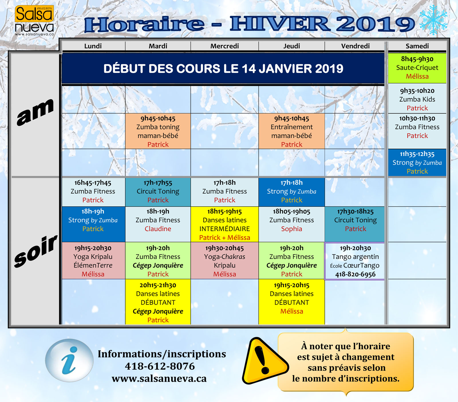 Voici les dates pour vous inscrire à la session HIVER 2019 (début des cours le 14 janvier):