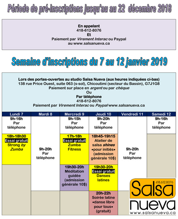 Les cours débutent cette semaine au studio Salsa Nueva / StudioDanse de Chicoutimi et le semaine prochaine au Cégep de Jonquière.