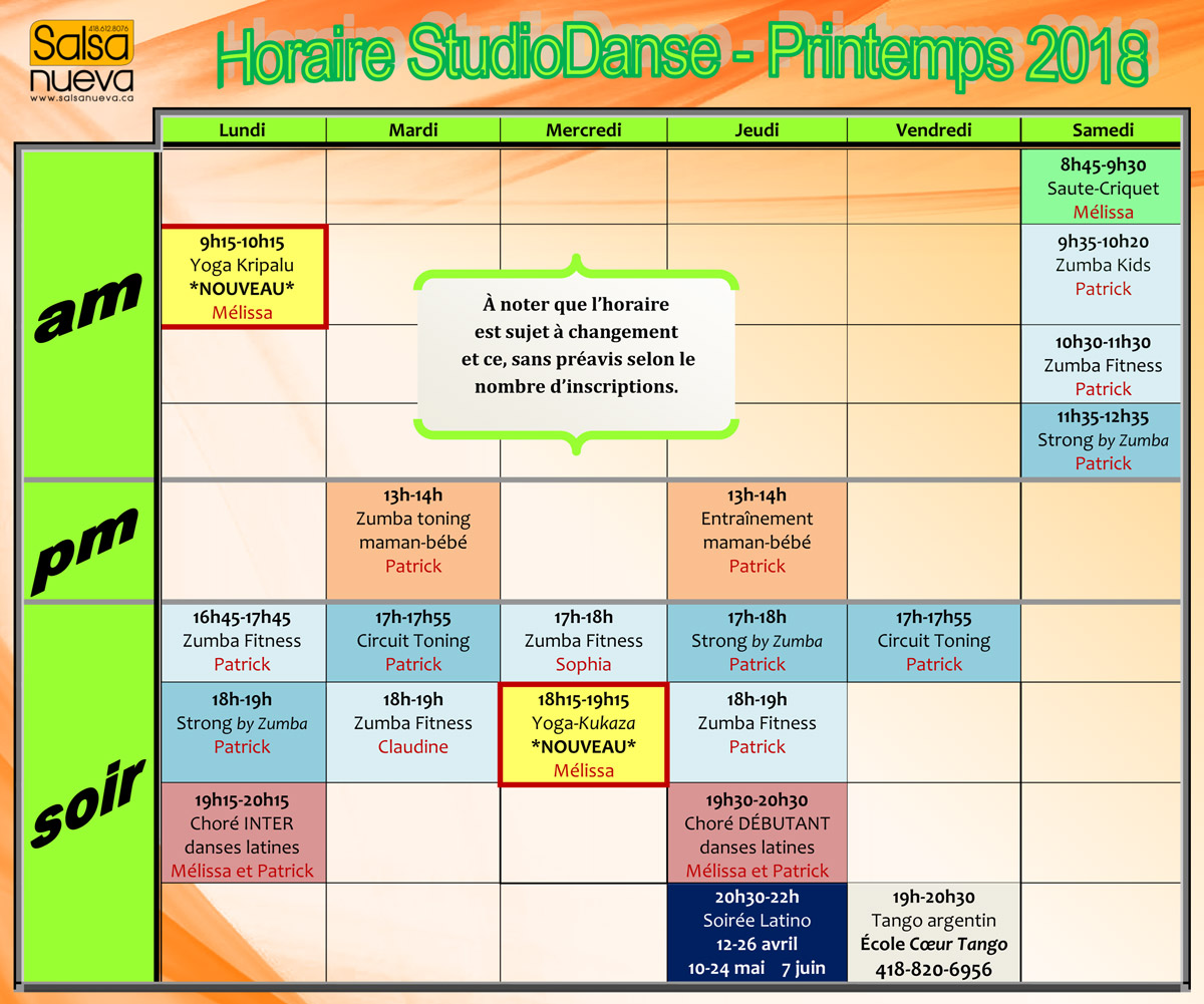 Voici la liste des cours offerts ce printemps chez Salsa Nueva.