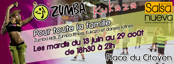 Nous débuterons les séances gratuites de Zumba et Kukaza extérieures tous les mardis à partir du 13 juin, et ce, pour tout l'été jusqu'au 29 août inclusivement.
