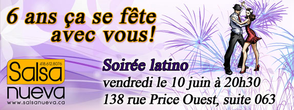 Pour souligner celà, nous vous invitons à une soirée latino pour tous où danseurs et non danseurs pourront festoyés avec nous ce vendredi le 10 juin 2016 à 20h30 au Studiodanse , 138 rue Price Ouest, suite 063, Chicoutimi: