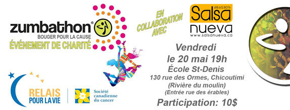 Les instructeurs de Zumba de Salsa Nueva serons présents bénévolrment à la grande marche du Relais pour la Vie qui se tiendra cette semaine du 3 au 4 juin 2016 au pavillon sprotif de l'UQAC.