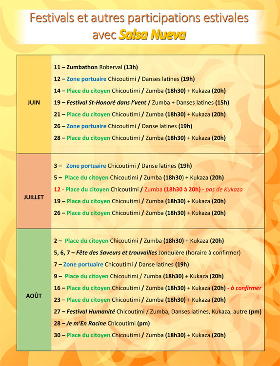 Nous sommes disponibles pour des activités scolaires de Zumba, de danses latines ou de Circuit Toning dans les écoles de la région. Veuillez communiquer avec nous par téléphone au 418-612 8076 ou par courriel: Salsa Nueva