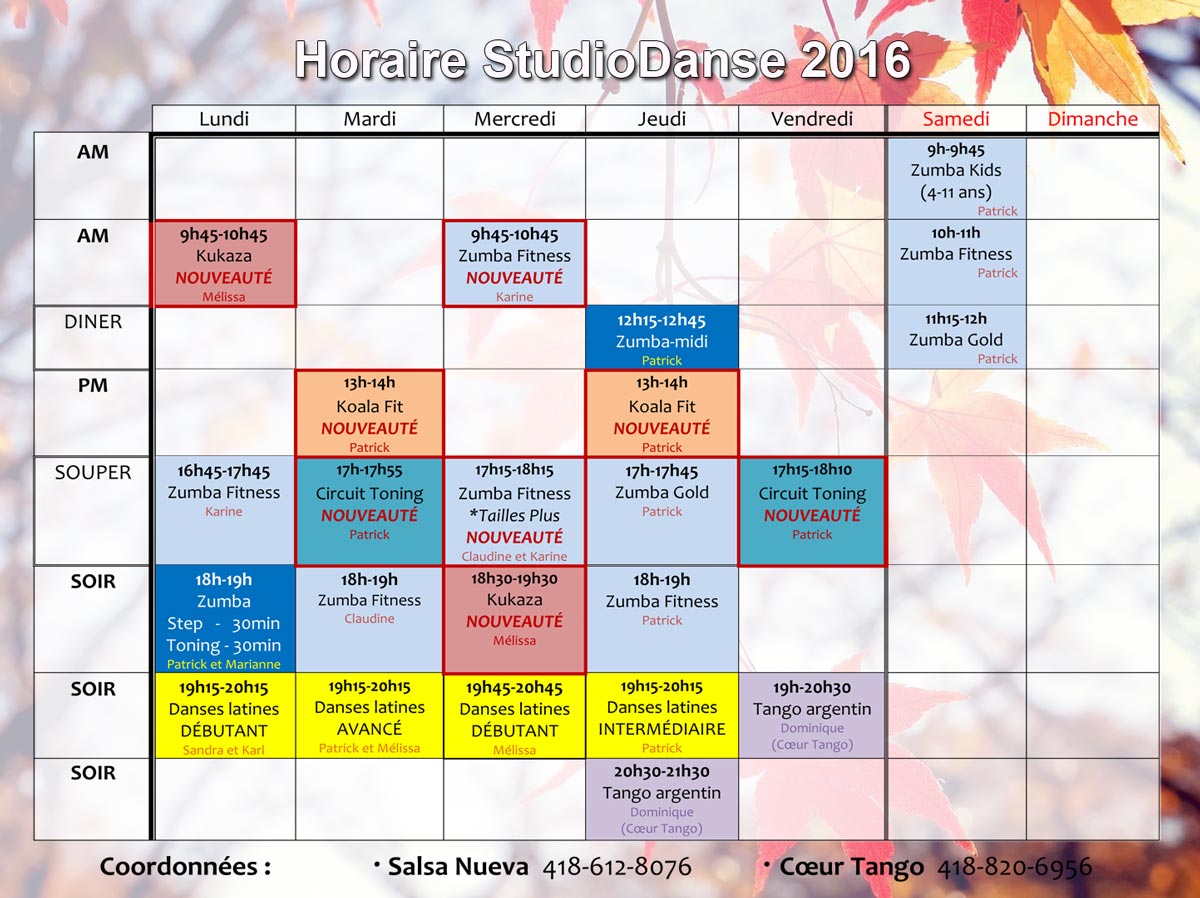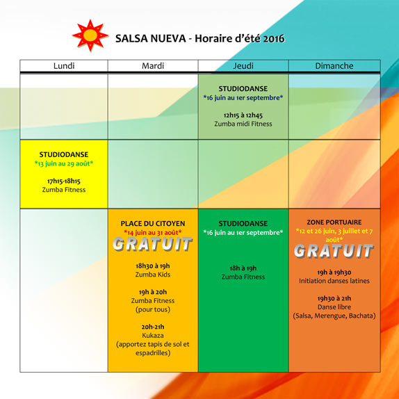 Voici l'horaire des cours pour l'été 2016 au StudioDanse et à l'extérieur.
