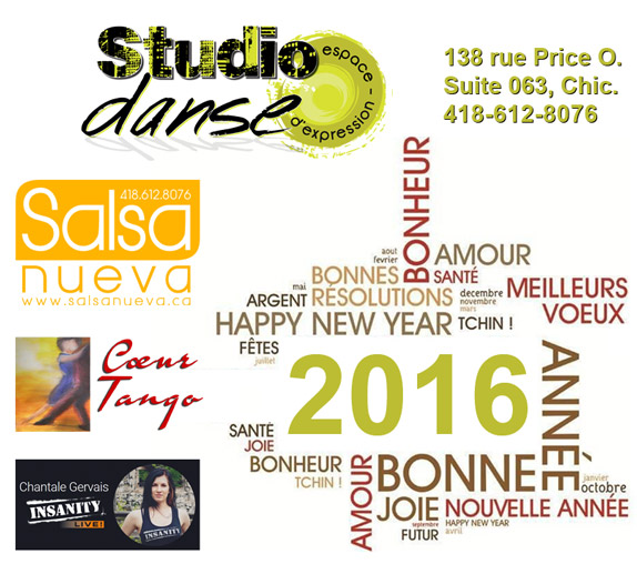 Le StudioDanse ainsi que les collaborateurs Salsa Nueva, Cœur Tango et Chantale Gervais vous souhaite une merveilleuse année remplie de joie et d'amour! Que la santé soit bienveillante pour vous et vos proches. Une belle résolution serait de choisir comme activité un cours avec l'un de nos collaborateurs ;)