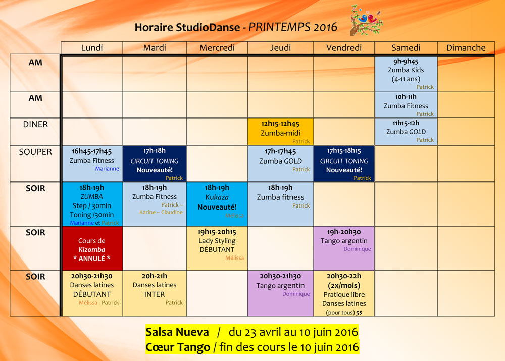Chers amis, voici le détails des modifications apportées à l'horaire des cours avec Salsa Nueva pour la session de printemps 2016: