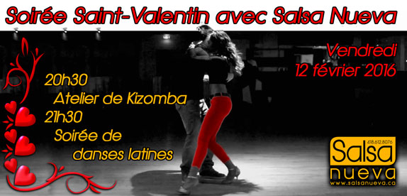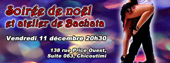 Vous voulez apprendre une séquence de danse exotique et suave? Salsa Nueva vous offre un atelier de Bachata vendredi le 11 décembre, de 20h30 à 21h30. Suivra la soirée latine de Noel de 21h30 à minuit! PARTAGEZ L'ÉVÈNEMENT ET PORTEZ DU ROUGE afin de courir la chance de GAGNER UN CERTIFICAT-CADEAU offert par Salsa Nueva lors de la soirée!