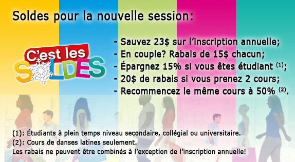 Profitez des soldes de fin de saison! Les cours débutent samedi le 5 mars pour le Zumba et lundi le 7 mars pour les danses latines.