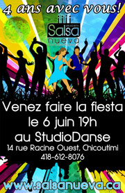 Salsa Nueva est avec vous depuis déjà 4 ans! C'est avec fièrté que nous vous invitons à notre soirée-spectacle du StudioDanse qui aura lieu le vendredi 6 juin 2014 au StudioDanse, 14 Racine Ouest à Chicoutimi.