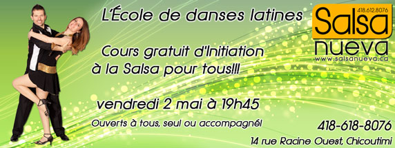 Vous êtes tous invités au cours gratuit d'Initiation à la Salsa pour tous!!! Nous ouvrirons alors nos portes pour toute personne désirant joindre le nouveau groupe de Salsa niveau débutant. L'initiation sera suivie d'une soirée de danses latines.