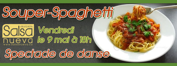 Sur une formule souper spaghetti et spectacle latin, nous voulons vous inviter le vendredi 9 mai 2014 au Studiodanse pour nous aider à financer ce voyage qui est pour nous important pour le fleurissement de l'école de danses latines Salsa Nueva. La troupe de 6 danseurs se rendra à Montréal pour 4 jours afin de performer sur scène et se former davantage afin d'offrir des cours, comme à l'habitude, de qualité.